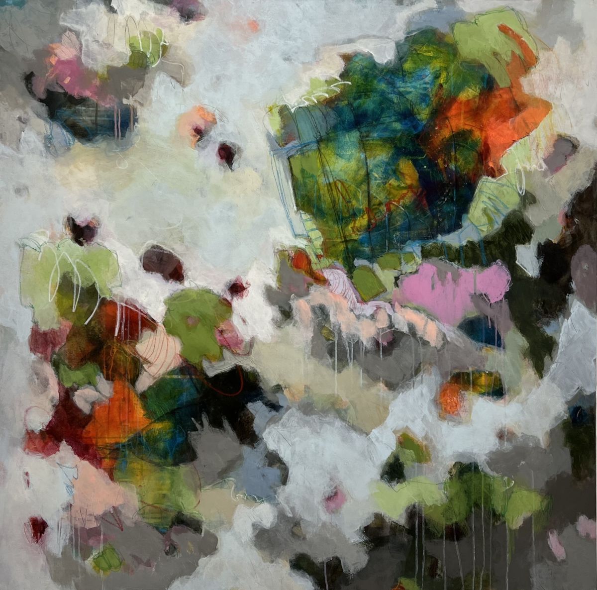 Image Credit: Etsuko Kaji-Holley, What’s On Your Mind?, acrylic, mixed media on canvas, 48 x 48″, $3,950.