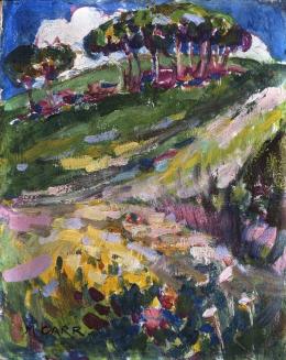 DescriptionVividly coloured landscape of trees perched on a rolling hill against a blue skyStatus
