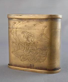 Descriptionlidded rectangular container with lozenge-shaped plan view; false bottom also has a lid & contains a pornographic scene on each sideStatus