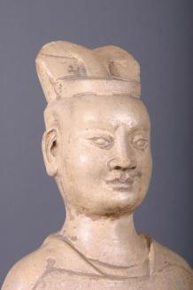 Descriptionstanding male figure wearing a long robe & court hat; hands clasped to chest; ; straw glaze with some red pigment in sleeve areaStatus