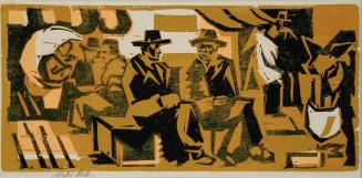 Descriptiona group of men, seatedColour: dark lime green;mustard;light orange;black
