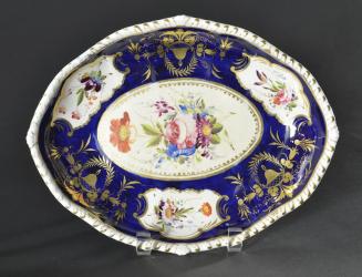 Descriptionoval dish has blue ground with three mirror shaped reserves in gilt C scroll cartouches around a large central oval with a gilt dentil border, all containing delicately painted polychrome floral sprays (larger bouquet in central reserve); gilt decoration (hanging baskets) also on blue ground between reserves; twelve sided rim has moulded edge trimmed with shell motif and gilt