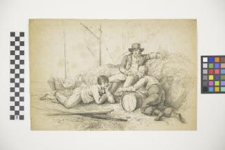 Descriptionthree figures with barrel; boat in backgroundStatus