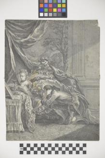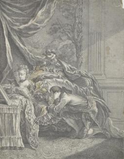 Descriptionreclining woman reading book; kneeling man kissing her handStatus
