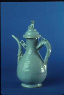 Descriptionlidded ewer with pale bluish-green glaze & moulded & applied decoration; handle represents a dragon; the spout has leaf-like applied decoration & is additionally attached to the body with an 8-shaped piece further up the spout; the body has very low-relief dragon & geometric floral motifs; the lid has a lion-dog(?) finialStatus