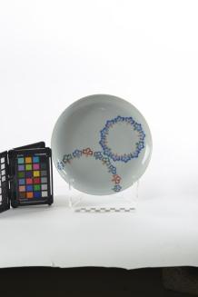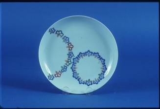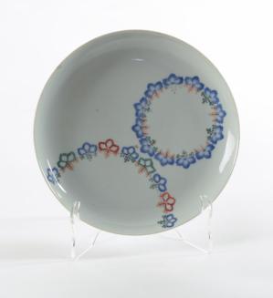 DescriptionKakiemon dish decorated in underglaze blue and overglaze enamels with a circle of underglaze blue petals with overglaze enamel stems and flowers, placed off centre, and semi circle of similar design also placed off centre. The underside of the rim with leaf scrolls in underglaze blue.Colour: blue;white