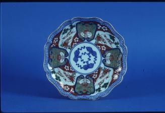 DescriptionOne of a pair of shaped Imari octagonal wave plates decorated in underglaze blue and overglaze enamels with stylised floral panels bordered by underglaze blue trellis pattern around the rim, and with an underglaze blue fungus pattern in the centre of the well. The underside of the rim with a continuous scroll.Status
