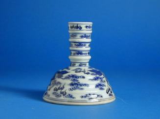 Descriptioncandlestick in form of an inverted stemcup; probably export for the Vietnamese market; underglaze cobalt blue design on a ridges & domed base of two qilin amid clouds; the ridged neck has four cloud & flame bandsStatus
