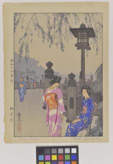 DescriptionTwo women standing near a bridge talking. There are people on the bridge.Status