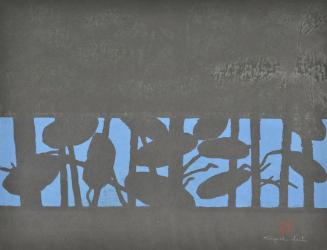 Descriptionblack trees on green background; self carved and self printed by artistStatus