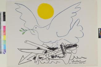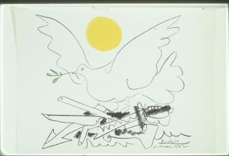 Descriptionprint depicts a dove carrying an olive branch in it's beak; overhead is a yellow sunStatus