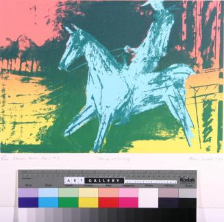 Descriptioncentral image is a horse & rider shape in blue on a green field, with large areas of yellow & orange in the cornersStatus