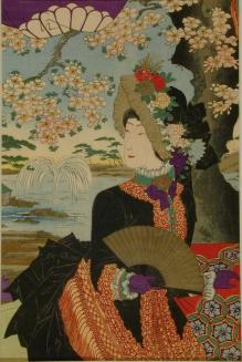 DescriptionJapanese Empress wearing a western style dress with bustle & a western style bonnet decorated with chrysanthemums & other flowers; she is holding a fan; water & a fountain in the background