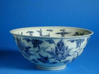 Descriptionblue & white bowl decorated in the well with a carp among wave scrolls. The cavetto has five carps interspersed with cross & scroll motifs above a band of waves. Decorated outside with lotus flowers & leaf scrolls.Status