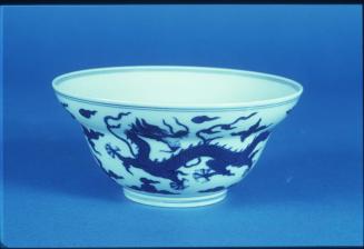 Descriptionblue and white bowl decorated in the well with dragon and cloud scrolls; outside decorated with two dragons and scrolls; 6 character seal mark of Tao kuang in underglaze blue on the base and of the periodStatus