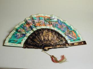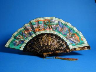 Descriptionfan has a dark brown finish with floral design & three figures on either side of the folds; colourful scene with people wearing silk costumes; the heads are of ivory, mother of pearl facesStatus