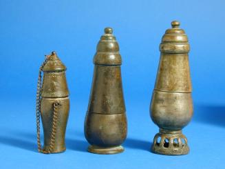 Descriptiontear shaped lidded lime pot. Base has openwork with a surface design. Lid has 3 ridges and a knob at topStatus