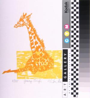 Descriptionseated orange giraffe, head in profile, on a yellow groundStatus