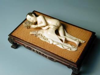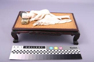 DescriptionSemi-nude, recumbent female figure, partially covered with a blanket, one hand resting on a flexed leg, the other touching a pillow with lower torso, legs and bound feet exposed. There is a rolled handscroll at one side and her hair and lips are tinted. She rests on a miniature rosewood daybed with cane top.Status
