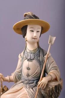 DescriptionSeated female figure, Xiang Fei seated on a rocky base, with one hand resting on a basket of flowers and the other holding a gardening implement with a long handle. The figure is in European dress with a long scarf tied at her neck and waist, long dress and coat and with a crownless hat through which the figure's hair projects. Figure rests on a flat round base. Details are lightly tinted.Status