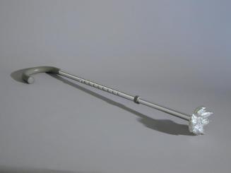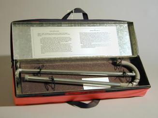 Descriptionthis sculpture is a collaboration between Mowry Baden and Steven Young; it is a metal cane with a wolf footprint on the distal end. It is encased in a rectangular aluminium case which is covered with flamingo pink waterproof fabric. Inside the case is a large label giving the Wolf Track Story and Instructions for Use.Status