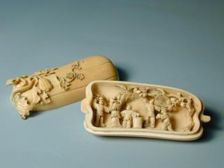 DescriptionBox carved as a slightly rectangular melon with stem, tendrils and leaves. The insides are carved with reliefs of a woman holding a child and four boys picking peaches on one side, and the other side has two running boys.Status