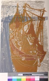 DescriptionA bird's eye view of a ship from the front of the vessel, which is marked" port" and "ye',. the boat is anchored to a grey dockStatus