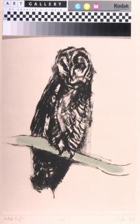 Descriptionfrontal view of an owl perched on a green branchStatus