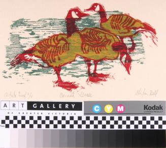Descriptionthree red geese against a green backgroundStatus