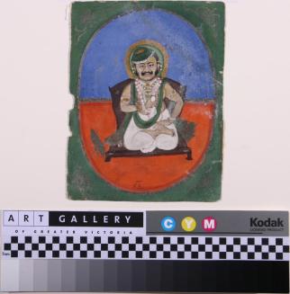 DescriptionPortrait of a Brahmin Priest; cross-legged male figure with a mustache, seated on a chair, with a green scarf and necklaces around his neck and a gold halo. Figure is enclosed within an oval that is blue at top and red at bottom and surrounded by a green background.