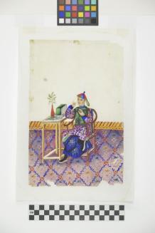 DescriptionSeated man with a blue, purple and green robe and conical hat in red and blue. There is a table with a green box and greenery in a vase and a purple floorStatus