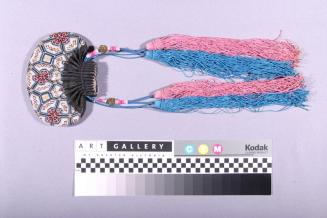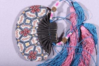 DescriptionPurse is flattened and roughly circular with a pleated opening at top threaded with blue cords, each end(2) of which has a metal knotted bead with embroidery and 2 tassels in pink and blue. Geometric grid-like petit point design in black, blue, maroon, yellow on white background covering the exteriorColour: black;blue;maroon;yellow;white