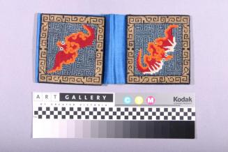 DescriptionCase with bat design in red,orange and white on a blue/black geometric background and a gold thread key border design. Case is comprised of 2 rigid squares as described above, lined and joined with a blue silk section with a slit or pocket in centre.Colour: orange;red;blue;black;gold;white
