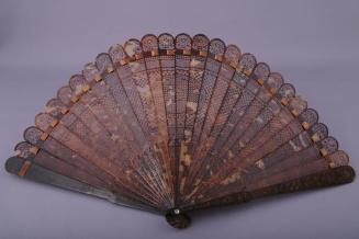 DescriptionBrown tortoise shell fan has 27 sections entirely decorated with elaborate geometric cutout designs, excepting the 2 end pieces which are solid and carved in a shallow relief. Pieces are threaded together with a brown silk ribbon and attached at one end with a metal rivet with a clear cut glass rhinestone on either end.Colour: brown