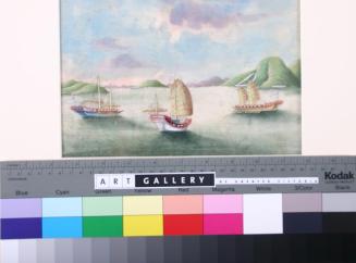 DescriptionThree Chinese saling ships in harbour. Two have sails furled and two have rows of oars.Status