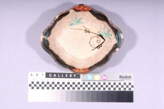 DescriptionDiamond shaped dish with undulating rim edges outlined in a black glaze. Overall glaze on interior and exterior is crackled white with a beige overglaze. There are enamel floral and leaf designs in green, black, red and yellow on rim and interior. Sits on an uneven base.Colour: beige;black;red;green;yellow