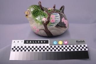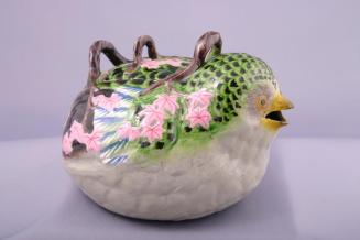 DescriptionQuail shaped teapot has a open yellow beak for the spout and green and black feathers on head and upper back. Wings at sides are blue and white. Brown branches form the 2 handle mount and lid knob. Pink flowers scattered at sides.Colour: grey;green;brown;blue;pink;yellow;black