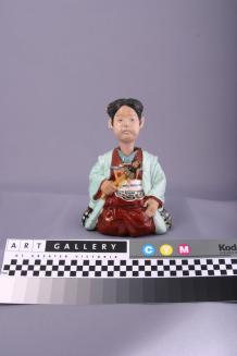 DescriptionHollow kneeling figure of a girl in a maroon and green kimono holding a doll in her right hand proper. Separate head has a weight at the bottom and rests by way of metal pins in the sides of neck, in the neck opening on the body allowing it to nod.Colour: maroon;green;black
