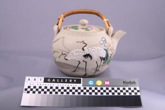 DescriptionLarge round grey teapot with multi-colour designs of cranes and flowers. Teapot has a bamboo handle and a facetted knob and perforation on the lid.Colour: grey;multi-coloured