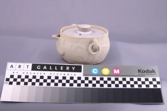 DescriptionSmall round unglazed white teapot with spout and two double rings at the sides. Replacement lid is glazed with spiral design and a flat knob in centre. Outside of pot has various seals impressed into it as well as decorative designs incised on to it.Colour: white
