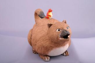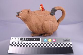 DescriptionTeapot in the shape of a badger; head with open mouth forms the spout and the tail loops into a handle. There is a small red badger on lid for the knob.Colour: brown;black;red;yellow