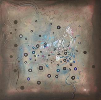 Descriptionseries of spheres and brush strokes in dark browns, purples, blues, teal and pastelsStatus