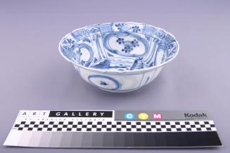 DescriptionThin walled bowl has a flared rim with delicately scalloped edge and a small straight foot. It is decorated with blue underglaze geometric and floral design with male figure at centre interior.Status