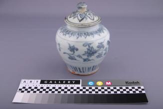 DescriptionSmall rounded jar has rounded lid and knob. Glazed in white with blue underglaze designs of florals and stylized leaves? Glaze stops just short of baseStatus