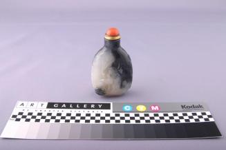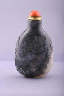 DescriptionBottle has a straight neck and sloping shoulders and a small straight foot. Carved design depicts 2 boys (Ho-Ho twins) wrestling beside a Buddhist gong on one side and a dragon amidst clouds on the reverse. Stopper is of carnelian and brass.Colour: black;white