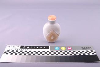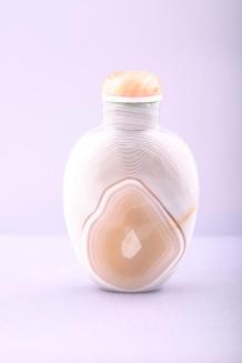 DescriptionBottle is a roughly flattened ovoid shape with a narrow base and a short straight neck. Agate body is white and beige and stopper is rounded orange carnelian with a disc of white stone at its base.Colour: beige;white;orange