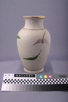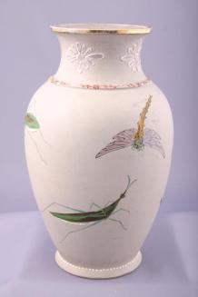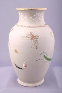DescriptionGrey vase has gently rounded shoulders, a slight flared neck, small flared foot, and ring at shoulders. Edge of rim is squared and glazed in gold. Neck has flower decorations and body has finely rendered multicoloured depictions of insectsColour: grey;multi-coloured