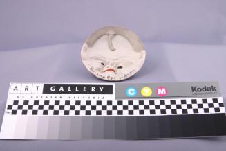 DescriptionShallow circular dish with raised relief of wrinkled face on interior with black eyes, red lips and grey hair. There is an inscription on inside rim.Colour: grey;red;black
