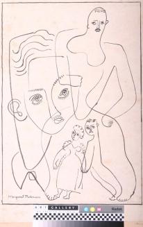 DescriptionBlack and white ink drawing portrays a large figure of a man and the face of a woman in the background at the top. Two smaller figures of a man and a woman in the foreground.Colour: black;white