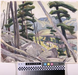 DescriptionLandscape scene depicts a rocky hillside and bare tree trunks in foregound, treed hillside in the background. There is a still life study with fruit and leaves au verso.Status
